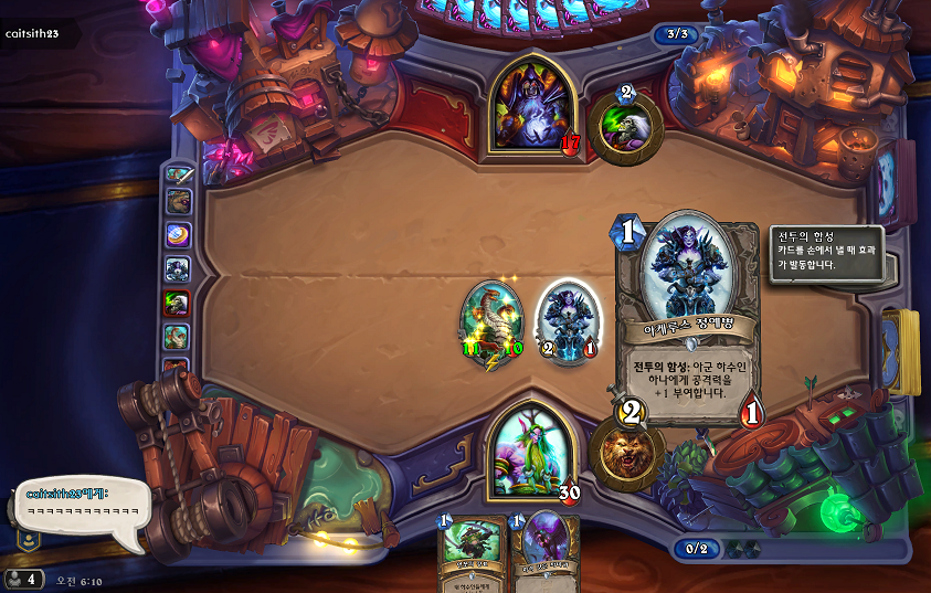 너프 전 가혹한 하사관은 본체칠때 좋았는데 이건 창 운반꾼이에요. 상대가 교환해줄때만 좋아. 어그로에 쓸 카드는 아니야.