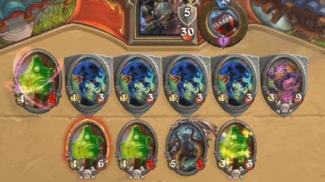 전함으로 상대가 깐 굵직한 하수인들을 치우고 역으로 필드를 먹을 수 있단 것도 좋지만, 더 좋은 건 바로 영능이다. 속박된 라자의 전함 효과를 받으면 게임 내내 0코스트로 난사가 가능하다.