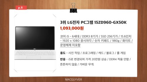 심지어 100만원짜리 엘지 노트북도 이번엔 맥북보다 높은데도 불구하고 튼튼하지않음 DDR4적용안함 이라고 단점 적어둔걸 볼수있다.