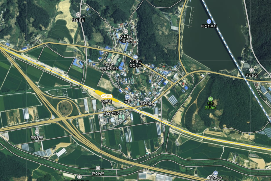 인천발 KTX 정차 예정역이다. 상단 지도에 보이는 어천저수지 위에 보이는 철길 보이는가? 저게 경부고속선인데, 저기로 송도역(수인선,송도신도시와 상관없고 연수구 옥련동에있다)에서 출발한 KTX가