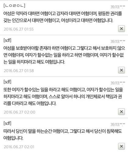 즉 남자가 여자한테 잘못하는 경우가 올라오면 여혐의 증거고 여자가 남자한테 잘못하는 경우가 올라와도 여혐 조장이므로 또한 여혐의 증거다 ㄴ사실상 만물이 여혐이다.