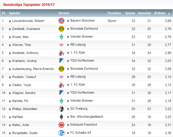 - 시즌 기록 중 굵은 글씨는 해당 시즌 최고 기록, 붉은색 글씨는 분데스리가 역대 최고 기록