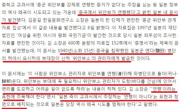 일본군에 의한 위안부의 강제연행은 여러 매체에서 공통적으로 확인해준 사항으로, 역갤 실자지들의 크기와는 다르게 조오오오오옺나 크고 아름답고 딴딴하고 확고하기 짝이없는 진실이다. 근데 역갤러새끼들과 일베충 새끼, 그리고 좆본의 넷우익새끼 남성인권연대 꼴마초 새끼들은 어디서 굴러먹었는지도 모를 좆같은 문서갖고 위안부가 강제연행된게 아니라고 빼애액 개지랄을 한다. 이 새끼들의 마인드는 강제연행이 없었다는 개소리를 쳐짖어댐으로써 이 문제를 일본 제국주의 정부의 전쟁범죄 문제가 아닌 개인의 문제로 돌리겠다는 속셈이다. 개 쌍놈의 새끼들... 이미 좆본의 극우들 사이에선 이러한 주장이 퍼졌고 심지어 위안부같은게 없었다고 부정하기도 한다. 그러나 현실은 냉혹하고도 엄정한 법이다.