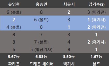 유영혁에게 붙어 8위를 두번 연속으로 시킨것도 모자라 팀전 결승에서 저주를 내려 최영훈과 강석인이 부진하게 만들었다. 유영혁의 앞을 가로막는 존재.