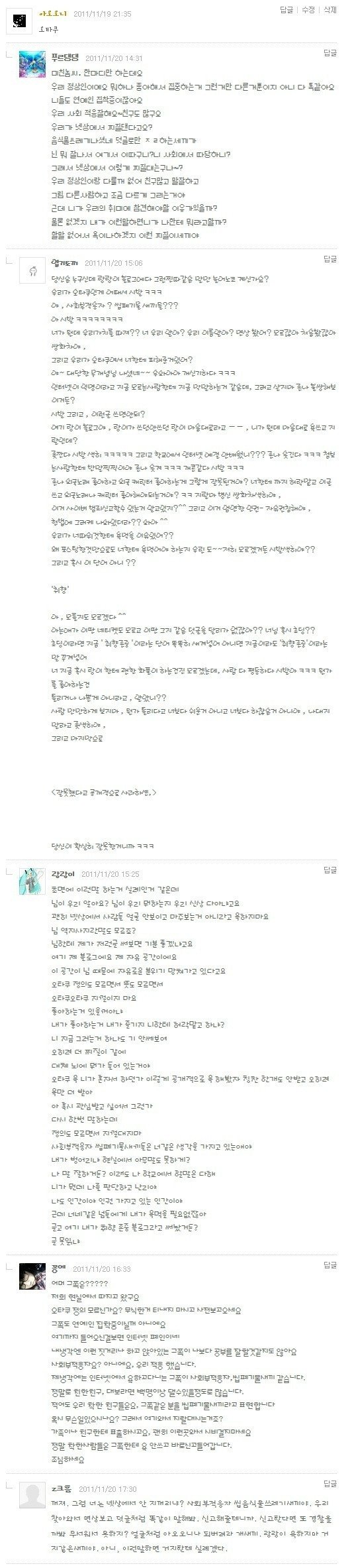 몇몇 씹덕들이 원래는 심한 욕을 적었고 나중에 오타쿠 세글자로 수정했다고 주장하는데, 네이버에서 댓글을 수정했으면 최근수정일로 댓글날짜가 바뀌기 때문에 그냥 씹덕들이 ㅂㄷㅂㄷ한거다. 분노조절장애 학교찐따 유영철 김길태랑 동급인 새끼들이다. 분개한 국민들의 횃불에 타뒤져야 마땅하다.