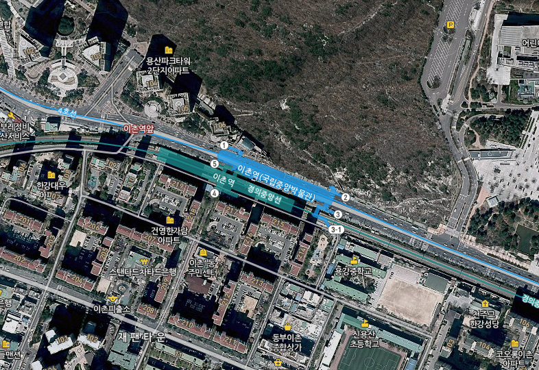 4호선:서울특별시 용산구 서빙고로 지하83 경의중앙선:서울특별시 용산구 이촌로71길 42