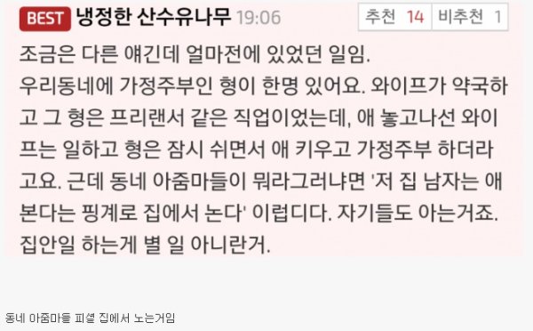 ㄴ 성별만 다를 뿐이지, 남편이 돈 가져다바쳐주는 럭키 야붕이들이나 마찬가지다. 이런 년들은 제발 좀 가사분담같은 개소리(몸이 불편한 경우는 제외.) 좀 하지마라. 남편은 사람도 아니냐?;