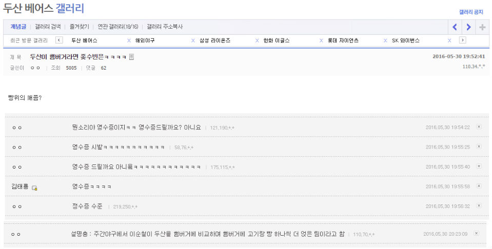 - ↑ 정수빈+영수증=정수증.