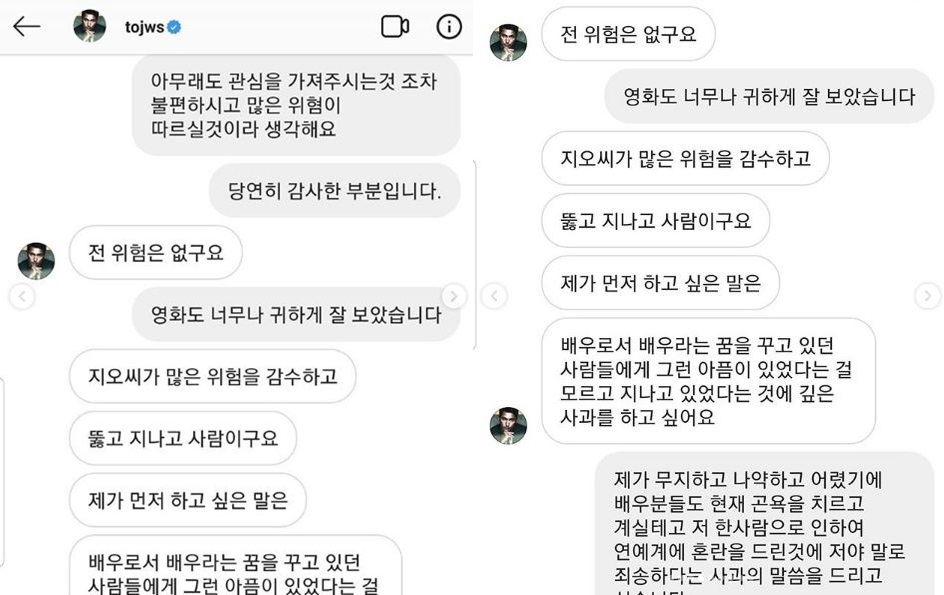 이 정우성의 개인적 dm을 윤지오가 정우성 허락도 받지 않고 오직 자신의 언플 (이렇게 유명한 연예인도 나 응원함)을 위해