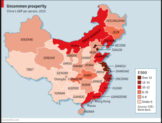 그러나 중국은 내륙 지역과 해안가 도시 지역의 격차가 상당한 편으로 도시 지역의 1인당 PPP는 30,000$ 달러가 넘을 거라는 예측도 있지만 농촌 지역은 아직도 1970년대 수준에서 벗어나질 못하고 있다.