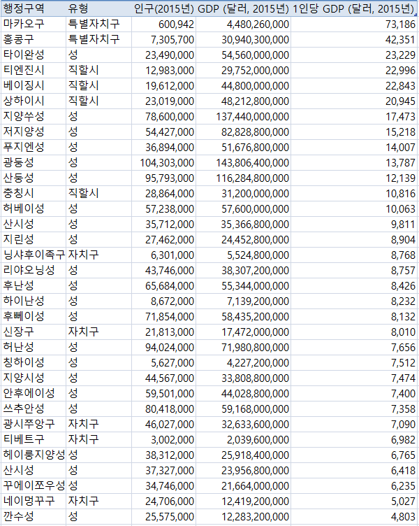 보다시피 중국을 성단위로 명목GDP를 따져 보았을 때 애초에 홍콩,마카오 같은 이레귤러를 제외하고는 제일 잘 사는 성조차 헬조선 평균은커녕 타이완조차 넘는 성이 한개도 없다.