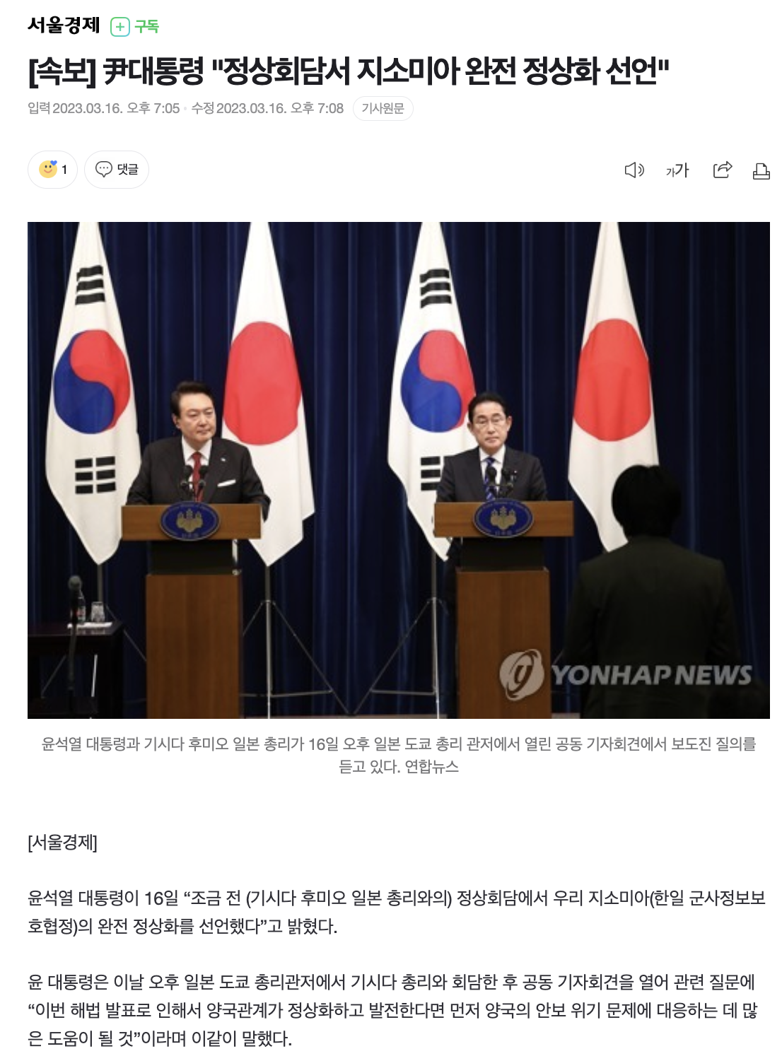 한일 군사정보포괄보호협정보다는 한미일 정보공유 협정이다. 북괴 미사일 때문에 체결했다.
