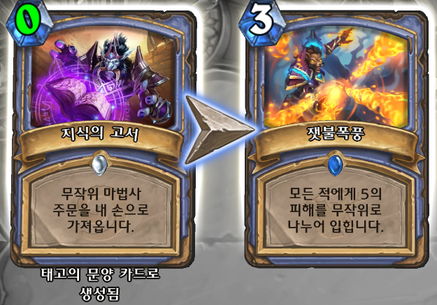 굳이 나은점을 찾아보면 주문이라 마술사의 수습생과 연계하면 0코로 쓸 수 있기도 하고 대마법사 안토니다스랑 연계도 되기는 하는데... 멀쩡한 신비한 화살이랑 별불꽃 놔두고 이런 운빨좆망 카드를 쓸 이유가 없다.