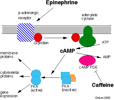 카페인은 여기서 cAMP 분해 효소인 PDE를 억제한다. 그 결과는 아드레날린이 존재하지 않는 시점에도 cAMP는 신경 세포 내에서 제거되지 않고 높은 농도로 유지되는 상황으로 이어진다. 즉, 스트레스 시그널을 꺼주는 신경 세포의 항상성을 강제로 깨 주는 역할을 카페인이 하는 거다.