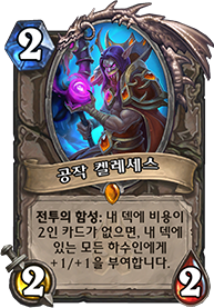 2코스트 2/2, 전투의 함성 : 내 덱에 비용이 2인 카드가 없으면, 덱 모든 하수인에게 +1/+1을 부여합니다. 콩 버프명은 켈레세스의 축복 콩