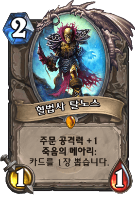 2코스트 1/1의 스탯에 주문 공격력 +1이 붙었고 죽메로 드로우가 하나 붙어있다. 딱봐도 스탯은 매우 구리지만 두 가지의 유용한 특능이 카드 하나에 붙어있다는 점에서 그 가치를 찾을 수 있다.