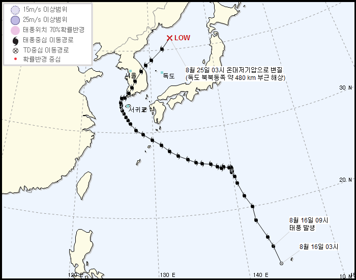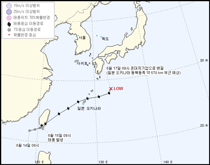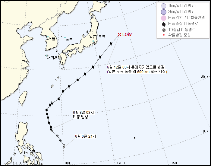 고기압 때문인지 대륙 진출 못하고 바다에서 뒈졌다.