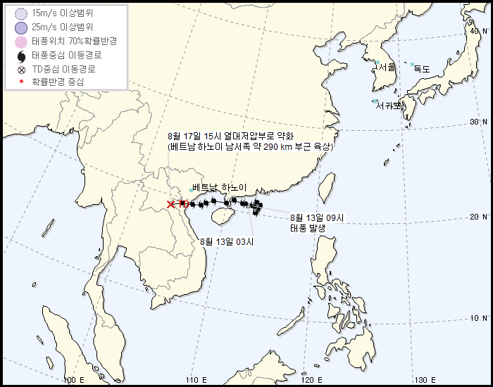 약해빠진 태풍이다. 헬조선쪽에 고기압이 자리잡고 있어서 베트남 쪽으로 갔다.