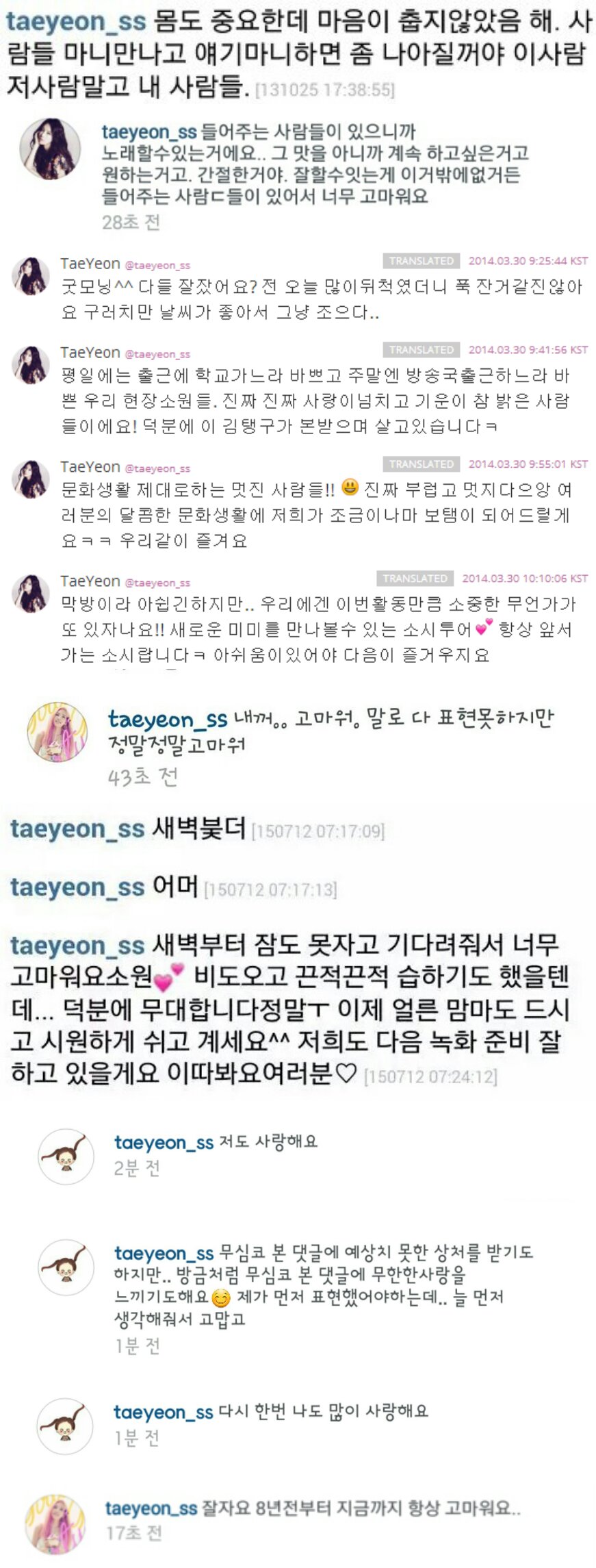 18. 일례로 2011년 즈음인가 태연이 팬들한테 앞으로 더 다가가겠다고 말했던 적이 있었는데 정말로 그 후로 팬들에게 더 가깝게 대해주기 시작. 2014~2015년에 들어서는 전보다도 더 팬들에게 표현을 자주, 풍부하게 해주는 것 같다. 그때 쯤에 한 인터뷰들이나 말들을 들어보면 본인이 스스로 뭔가 더 표현하기 위해 노력하기 시작한 느낌. 주변인들의 말을 들어보면 원래 감정 표현이 조금은 서툰 사람이라서 본인도 그것을 알고 많이 노력하는 것 같다. 물론 전지적 덕후 시점 궁예이니 적당히 가려서 듣자.