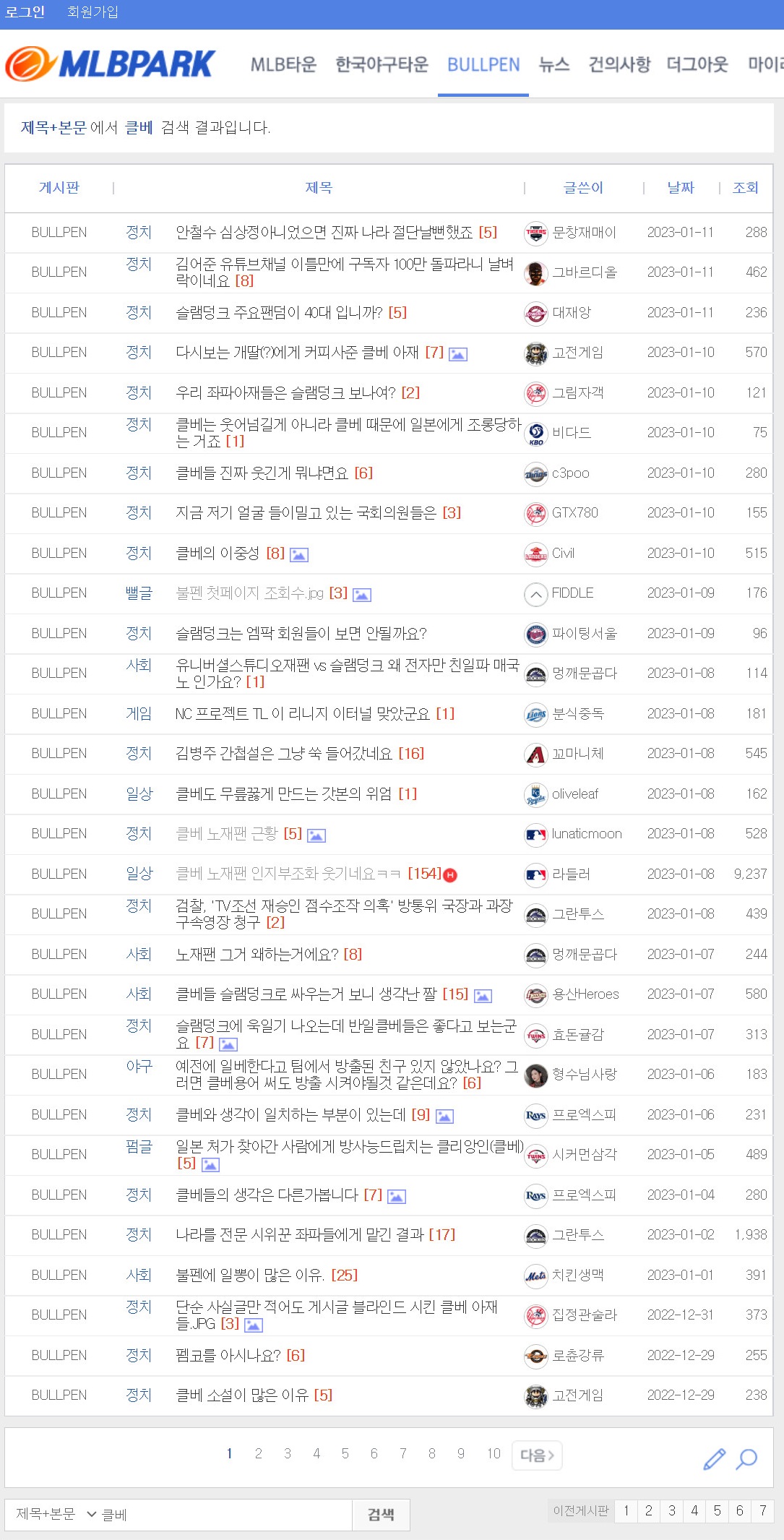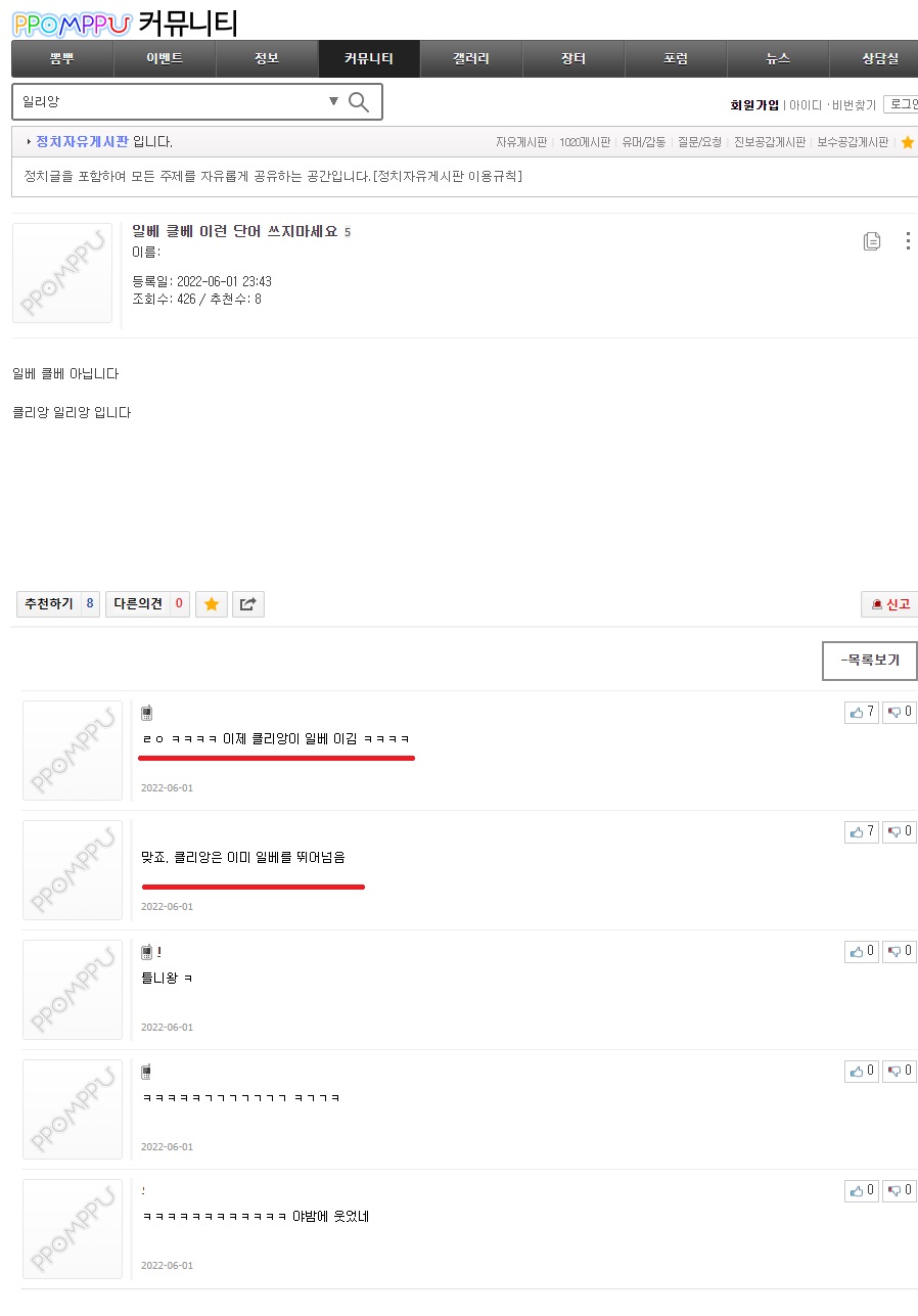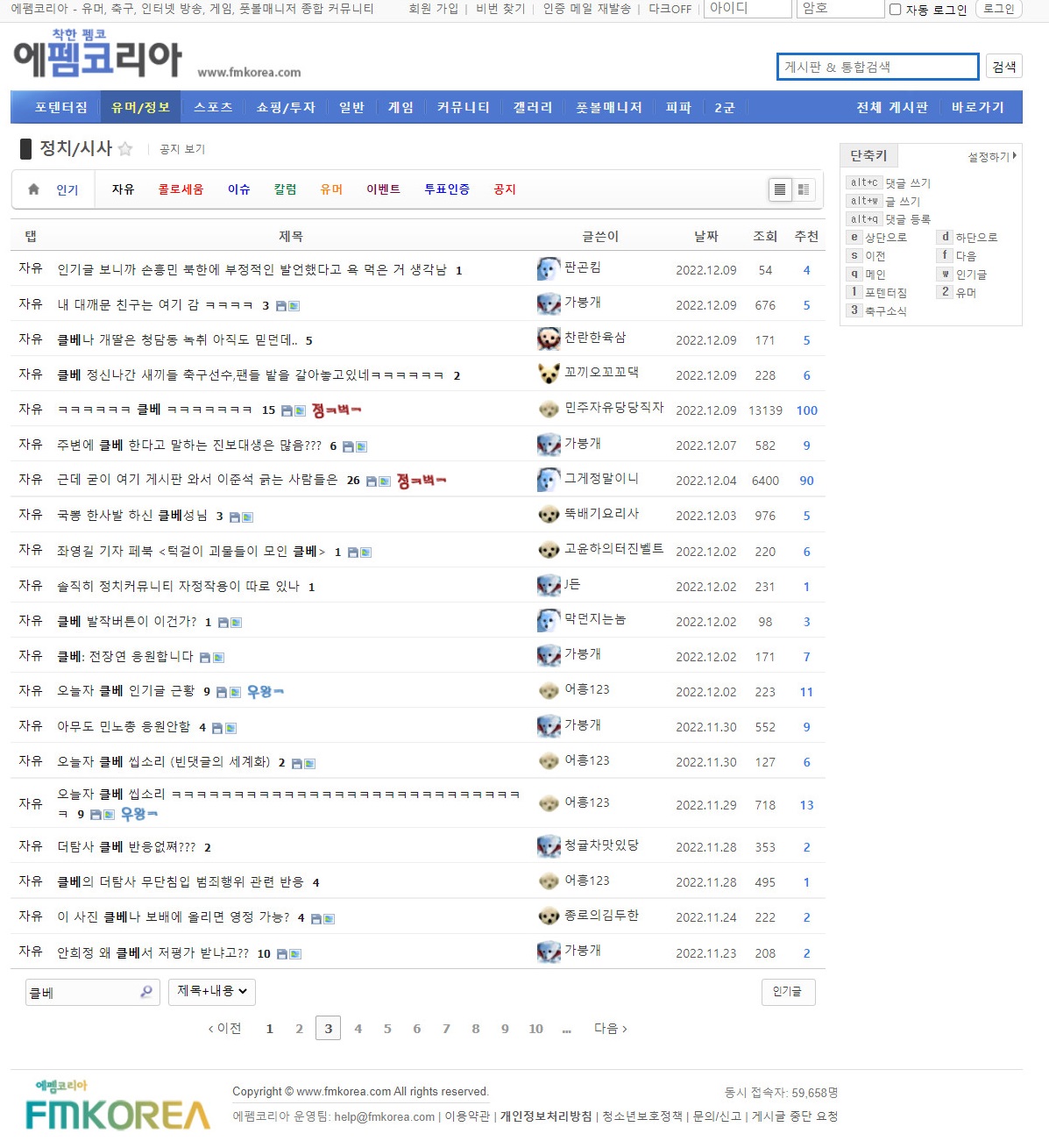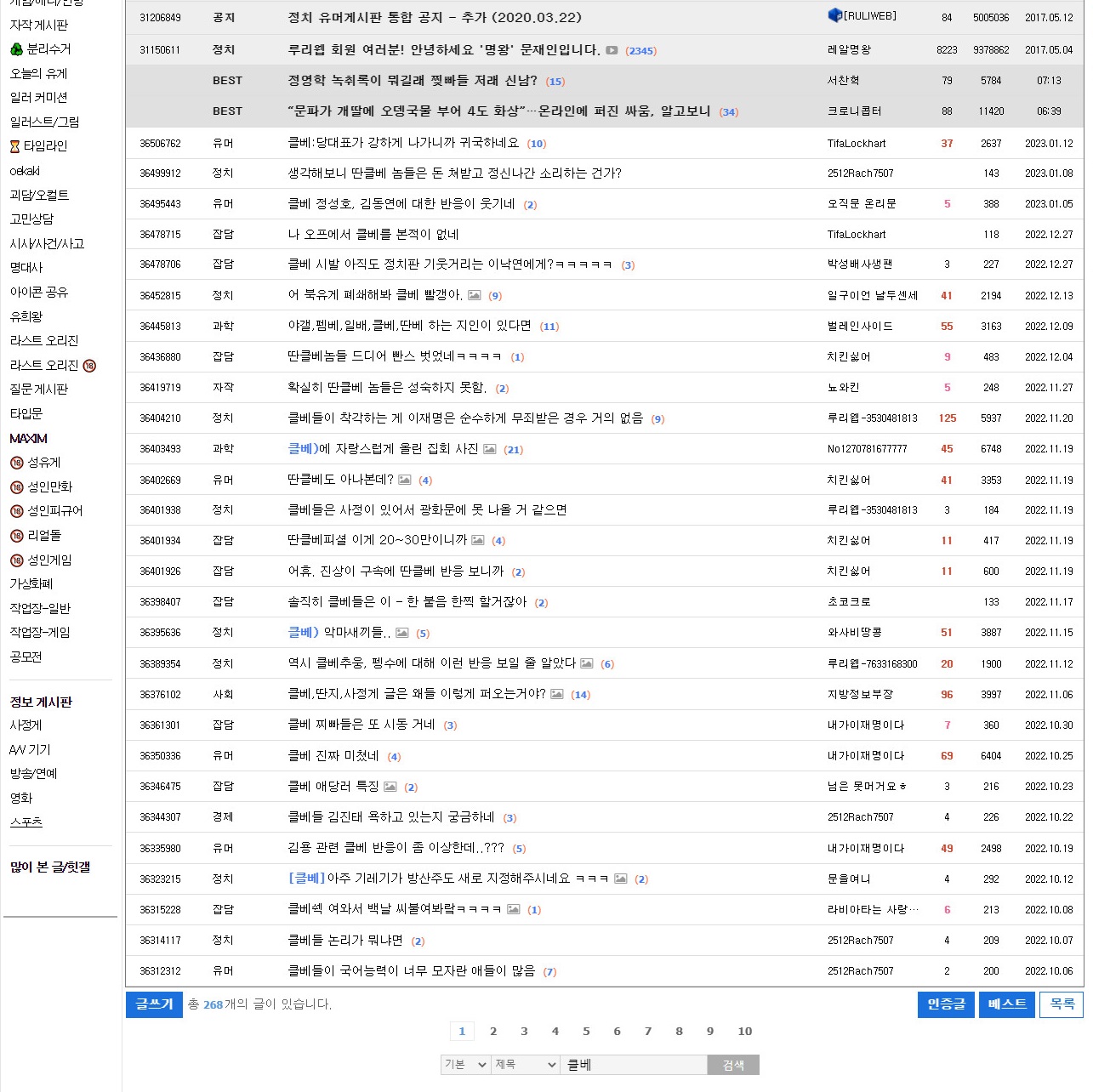 정치게시판 분리를 하지 않은 결과, 역시나 불편충들과 정치병자들의 아지트가 됐다. 이게 자유게시판인지 정치게시판인지? 종교인들의 모임이라고 봐도 무방하다. 공통된 적을 계속해서 만들어내며 그것에 대해 다같이 욕하고 동질감과 소속감을 느끼는 곳이다. 반박가능?