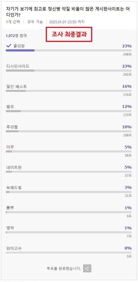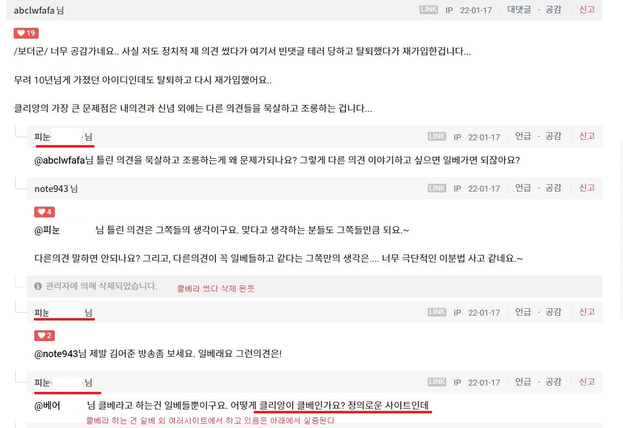 제발 김어준 방송좀 보세요. 일베래요 그런의견은!!!! 정의로운 사이트... 클리앙, 지들과 다른 의견내면 온갖 테러하고, 그 외에도 사이트에서 온갖 만행을 일삼으며 욕을 그렇게 먹고도 정의롭다는 망상 이러니 일베는 자기가 막장인 줄 아는데, 클베는 모른다고 하는 것이다. 문제가 자각이 안 되니 갱생의 가능성이 없다