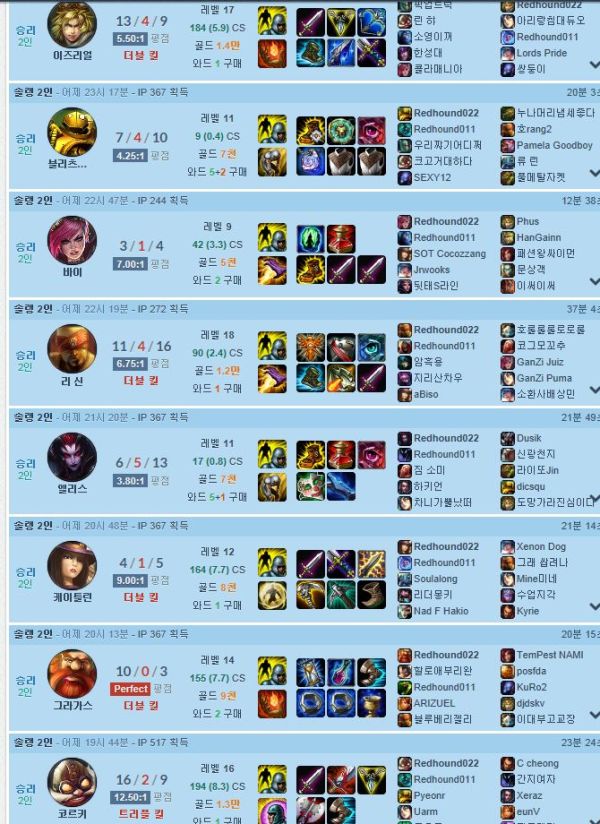 16년 3월 휴가때 배치에서 다1 달성. 정글만 잡았다 하면 거의 캐리하는 모습을 보여주나 탑 포지션은 필패, 원딜은 탑보단 나으나 패배하는 경우가 많다.