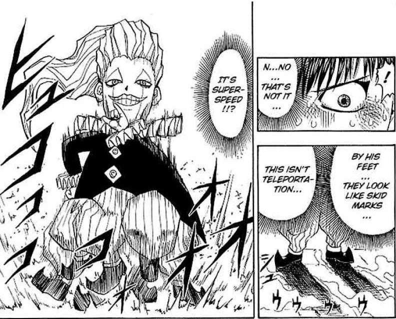 처음에는 순간이동처럼 동에 번쩍 서에 번쩍 하는 모습을 보고 갓슈와 키요마로가 놀라지만 곧바로 키요마로의 뛰어난 관찰 실력으로 바닥이 급브레이크 한 것처럼 검게 물들어진 발자국을 보고 이 주술의 특징을 알아낸다.