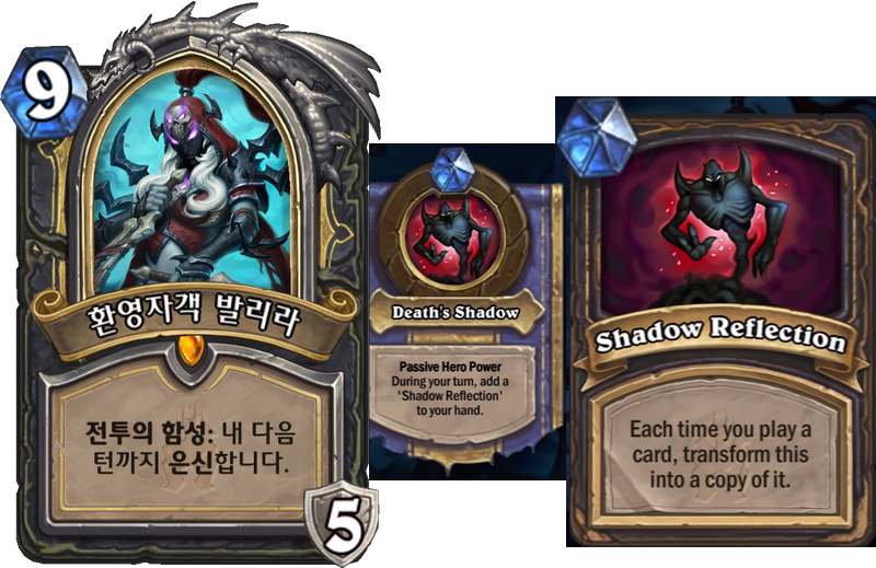 영웅 능력이 특이한데, '죽음의 환영'이라는 패시브 능력이다. 자신의 턴마다 '그림자 환영' 카드를 손에 넣는다.