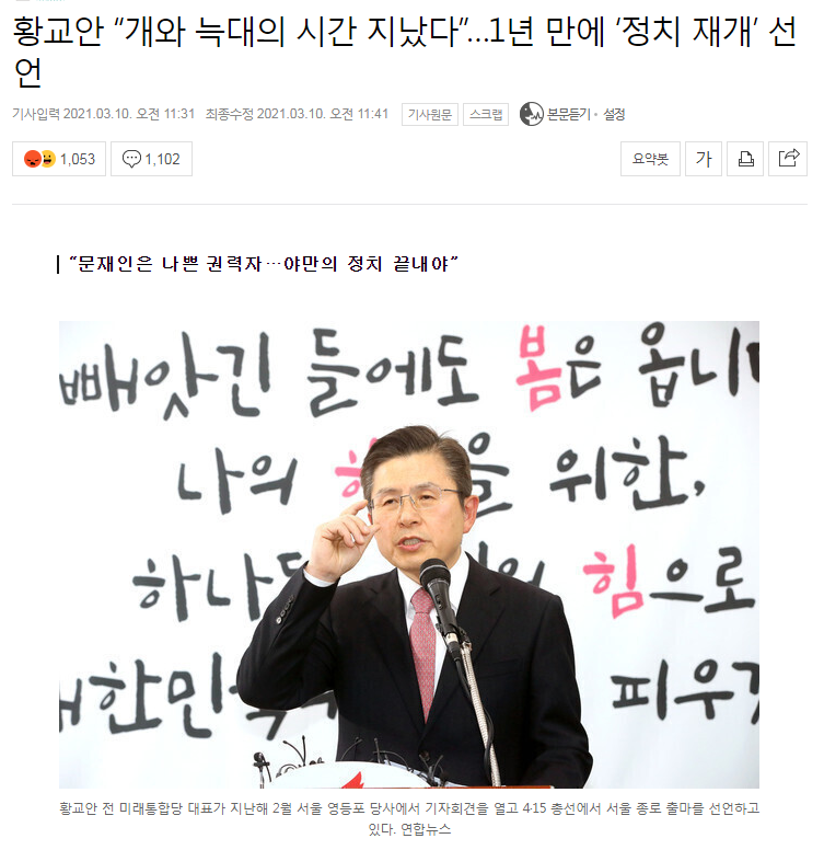 정계에서 물러나기라도 하는가 했더니... 인물 없는 보수에서 대권 후보 1순위로 거론되었던 인물인데 결국 다음 대선과 총선에 나오려고 하나 보다. 당연히 민주당에선 국정농단을 언급하면서 난리 났고, 한국당에서도 깜냥은 없는데 1등은 먹고 싶은 애들(김진태, 오세훈 등)이 환영한다고 하면서도 견제구 던지고 있다. 기독교 보수 단체에서 밀어주는 중이라고 한다.