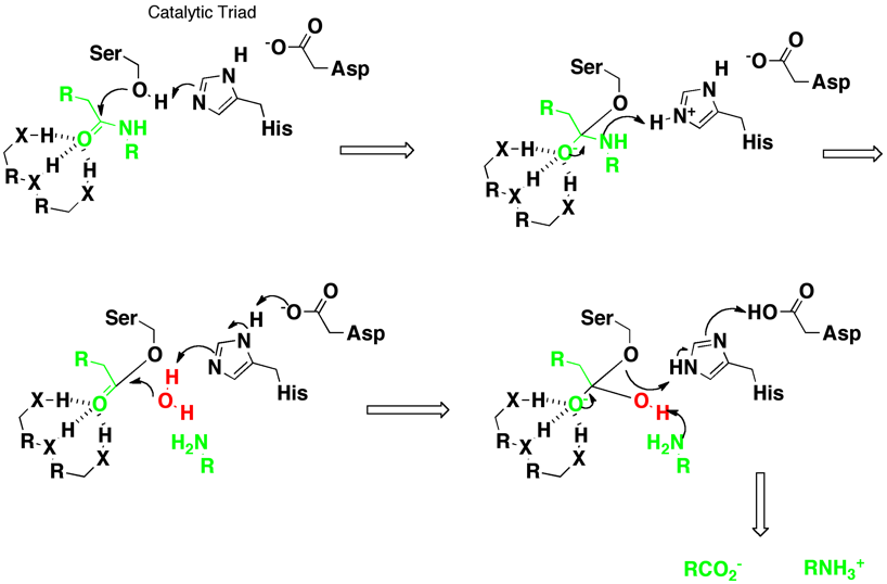 Catalytic Triad는 active site 안에 성능이 좋은 친핵체 하나와, 여기 이웃한 전자나 양성자를 수용하고 뱉을 수 있는 2개 이상의 작용기 집단을 말한다. 중간체에 달라붙은 친핵체를 다시 재생하고, 생성물을 분리하기 위해 catalytic triad는 대부분 가장 흔한 친핵체인 물을 사용한다. 이를 출입하도록 할 수 있게 active site의 모양도 전체적으로 변한다. 친핵체 역할은 주변 작용기에 의해 전자 밀도가 높아진 세린, 트레오닌, 시스테인이 맡는다.