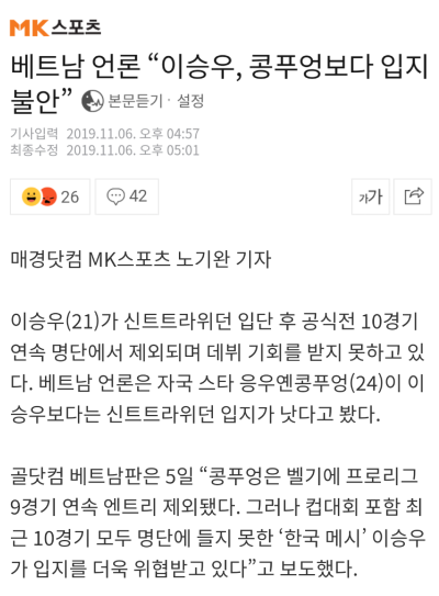 ㄴ 아시안컵도 아니고 아시안 게임 그것도 대학생 5명 포함한 일본전에서 1골 넣었다고 잘나간다고???? ㅋㅋㅋ 잘나가는데 왜 벨기에 리그에서도 방출당했는지 설명좀
