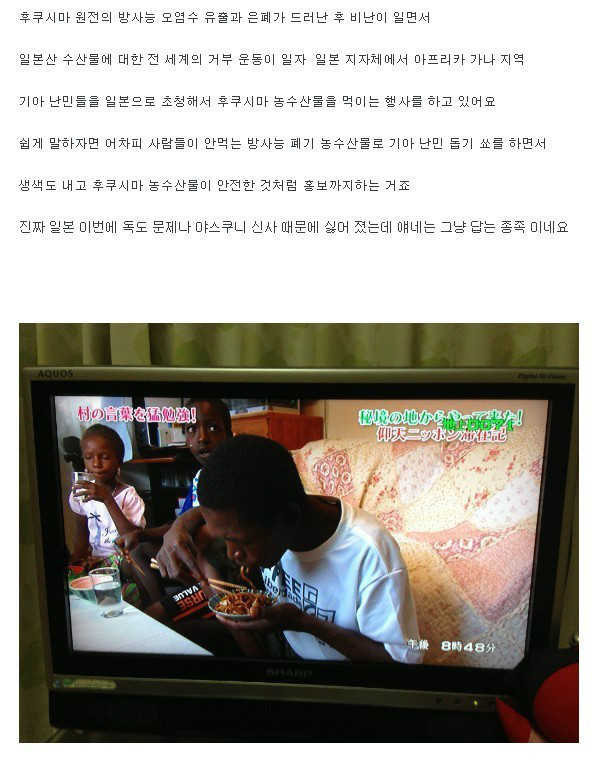 이제 후쿠시마 음식물이 방사능으로부터 안전해서 한 번 쯤은 맛보라고 ((리더))가 증명 했으니 다시 한 번, 통한의 박수를 쳐 주자.