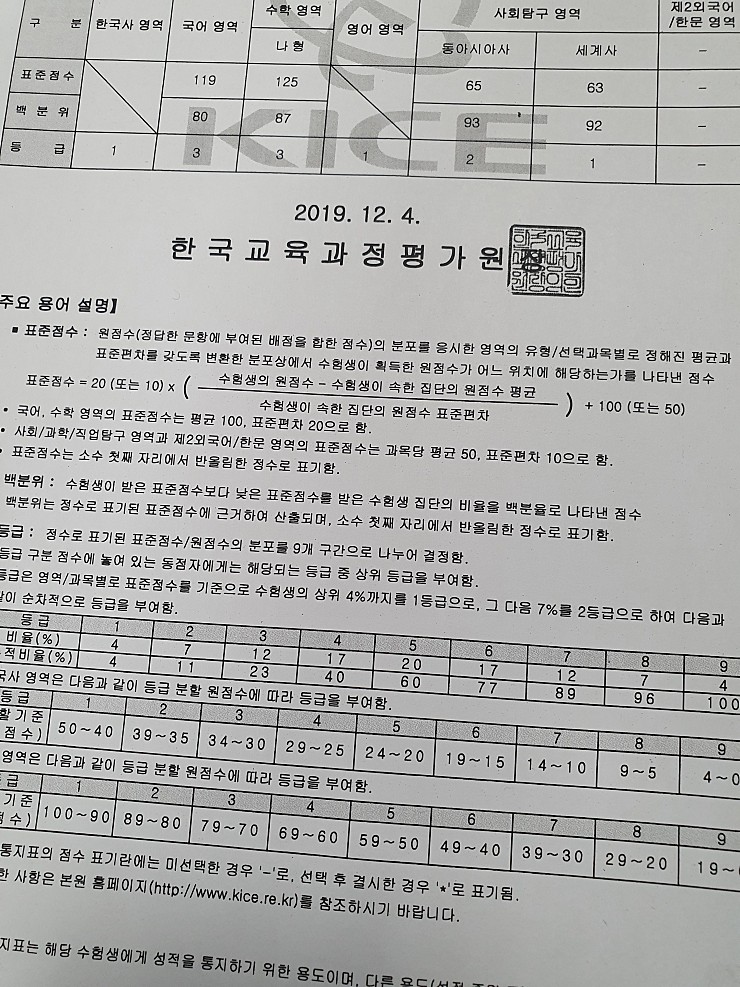백분위 92지만 표점증발로 1등급을 받은 사례가 있다.