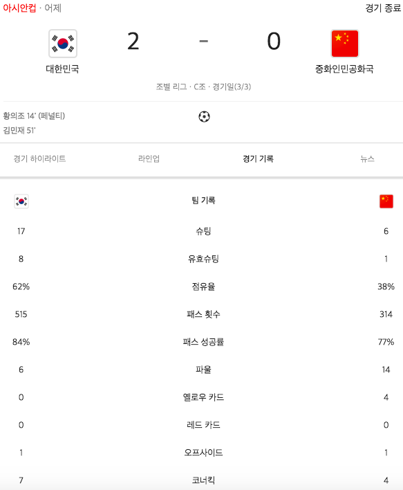 자세한 내용은 아래에 있음. 일단 중국의 소림축구는 정말 더러웠고, 한국은 ㅅㅌㅊ 경기력을 보여주었다. 결국 무실점으로 조1위 16강을 차지했다. |