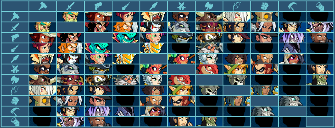 모두 히트박스가 똑같고, 차이점은 스탯(전 캐릭터 합 22), 무기의 조합, 그리고 강공격 뿐이다. 덕분에 무기 한두가지만 연마를 해놓으면 딴 레전드로 쉽게 갈아타는 것이 가능하다.