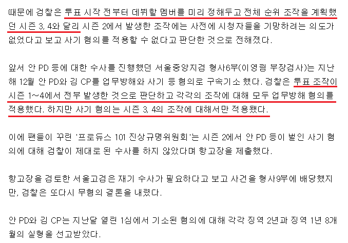 판사왈 "피고의 공소사실을 모두 유죄로 인정한다"며 "순위조작 범행에 메인 프로듀서로 적극 가담한 점에서 피고인의 책임이 결코 가볍지 않다. 대중 불신에도 큰 책임이 있다. 국민 프로듀싱이라는 기본 취지에 맞지 않게 조작을 모의해 책임이 중하다. 다만, 시청자 투표 결과를 그대로 따르면 성공적인 데뷔가 어려울까 우려한 점, 개인의 이익을 도모하지 않은 점, 향응을 대가로 실제 부정행위가 인정되지 않은 점 등을 고려했다"