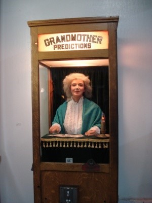 나무로 된 유리창이 있는 자판기안에 할머니 모습의 인형이 있는 모습이고 전등과 전원코드가 있다.