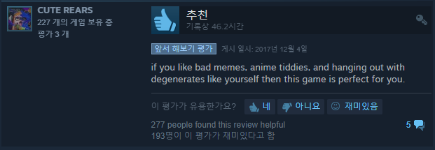 만약 니가 썩어빠진 밈이랑 애니 젖탱이를 빠는 씹뜨억이라면, 혹은 너같은 개돼지들과 노는게 재밌다면 딱 너에게 어울리는 게임이다. |