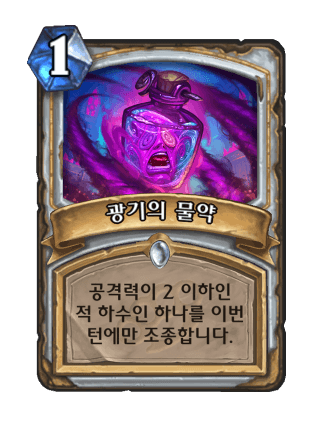 똥카드라 안쓰였던 암흑의 광기를 폭싹 줄인 버전이지만 4코스트에 3공격력 → 1코스트에 2공격력 이렇게 너무 사기적으로 줄여서 사기카드가 되었다.