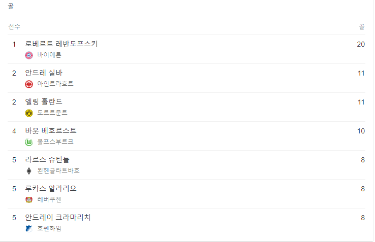 | 2020/21 | 바이에른 | FW | 29/29 | 2.50 | 28 | 1 | 6 | 2458 | 41 | 9 | 50 | 9/8 | 4 | 0 | 0 | 9 | 11 | 7 |