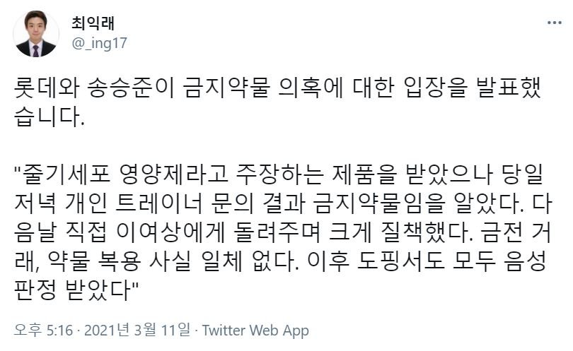 이여상한테서 받은 금지약물을 다시 돌려줬다는 증거가 없어서 72경기 중징계 먹었다 ㅅㅂ 왜 신고를 안해서